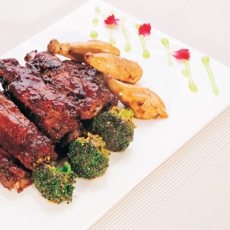 6.排骨、大腳菇、西蘭花立體擺盤,簡單盤飾即可。
