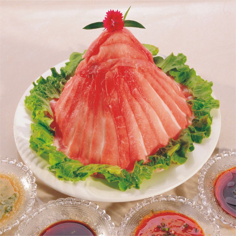 A.帶皮精五花肉凍4小時(shí),刨1毫米片,150*80*1MM,整齊擺放于冰碎上,立體造型,日式草葉鋪底。