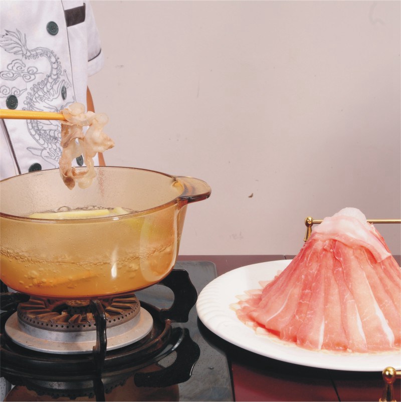 B.中火煮礦泉水(山泉水為最佳,不能使用自來(lái)水,因自來(lái)水中含氯制劑高影響口感),加以姜汁酒,小蔥段,煮開(kāi),下肉片,灼至肉片卷曲,即可撈出,灼好金針菇,灼好有機(jī)蔬菜圍邊。配以香辣蒜蓉碟,小蔥醬油碟、白切姜蔥碟,供蘸食